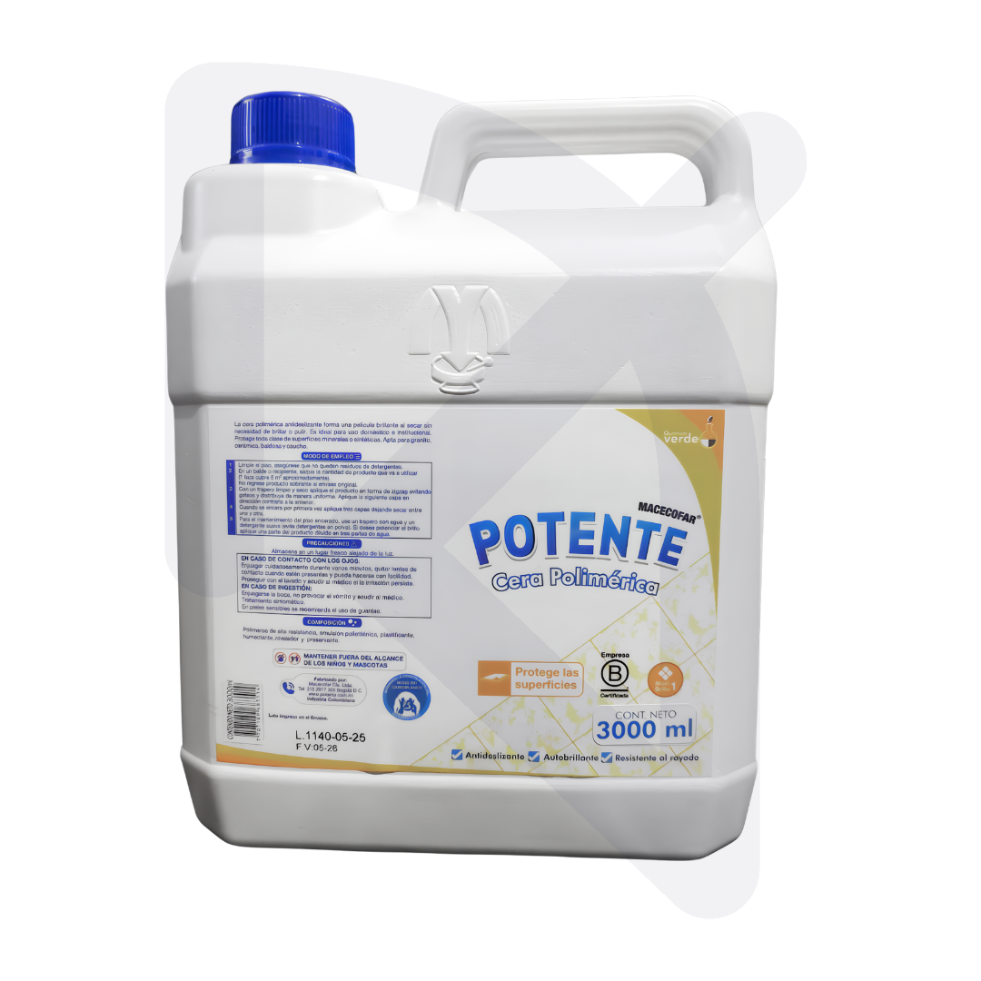 La cera polimérica Potente blanca en presentación de 3800 ml está formulada para proteger y realzar el brillo de diferentes tipos de pisos. Su tecnología de polímeros crea una capa resistente que ayuda a prevenir rayones, desgaste y acumulación de suciedad, manteniendo una apariencia limpia por más tiempo. Es ideal para superficies como cerámica, granito, baldosa o vinilo, y se utiliza en hogares, oficinas e instituciones donde se requiere durabilidad y acabado brillante.