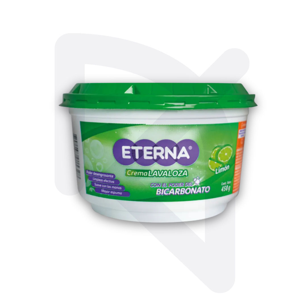 Crema lavaloza Eterna limón 450 g. Elimina grasa difícil, rinde más y deja la vajilla limpia con aroma fresco a limón.