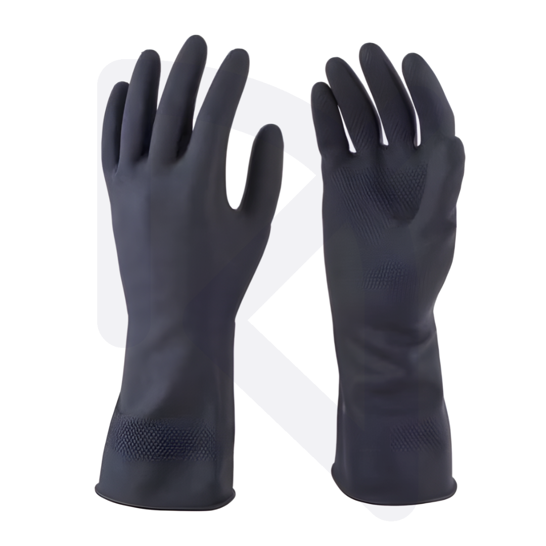 Guantes de caucho negro resistentes y reutilizables. Ideales para limpieza, industria, mecánica y protección de las manos.