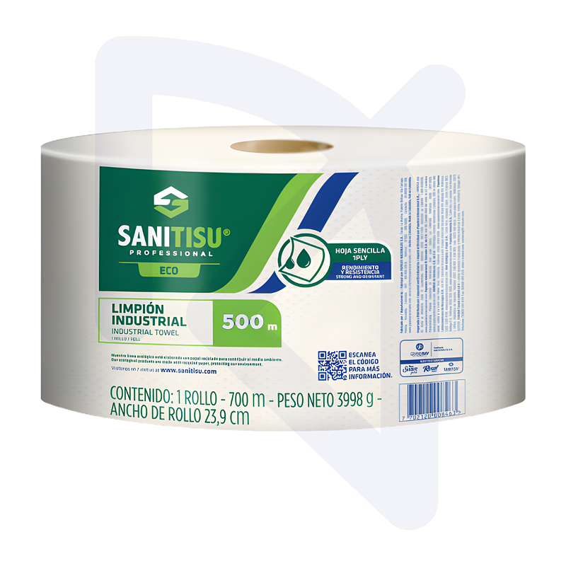 Rollo limpión industrial hoja sencilla Sanitisu 500m, alta absorción y resistencia. Ideal para limpieza profesional y uso continuo en negocios.