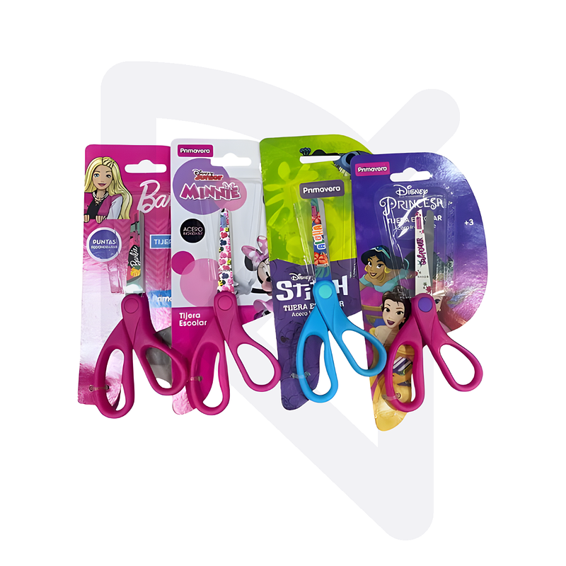Tijera Primavera punta roma con personajes infantiles. Corte seguro y cómodo para actividades escolares y manualidades.