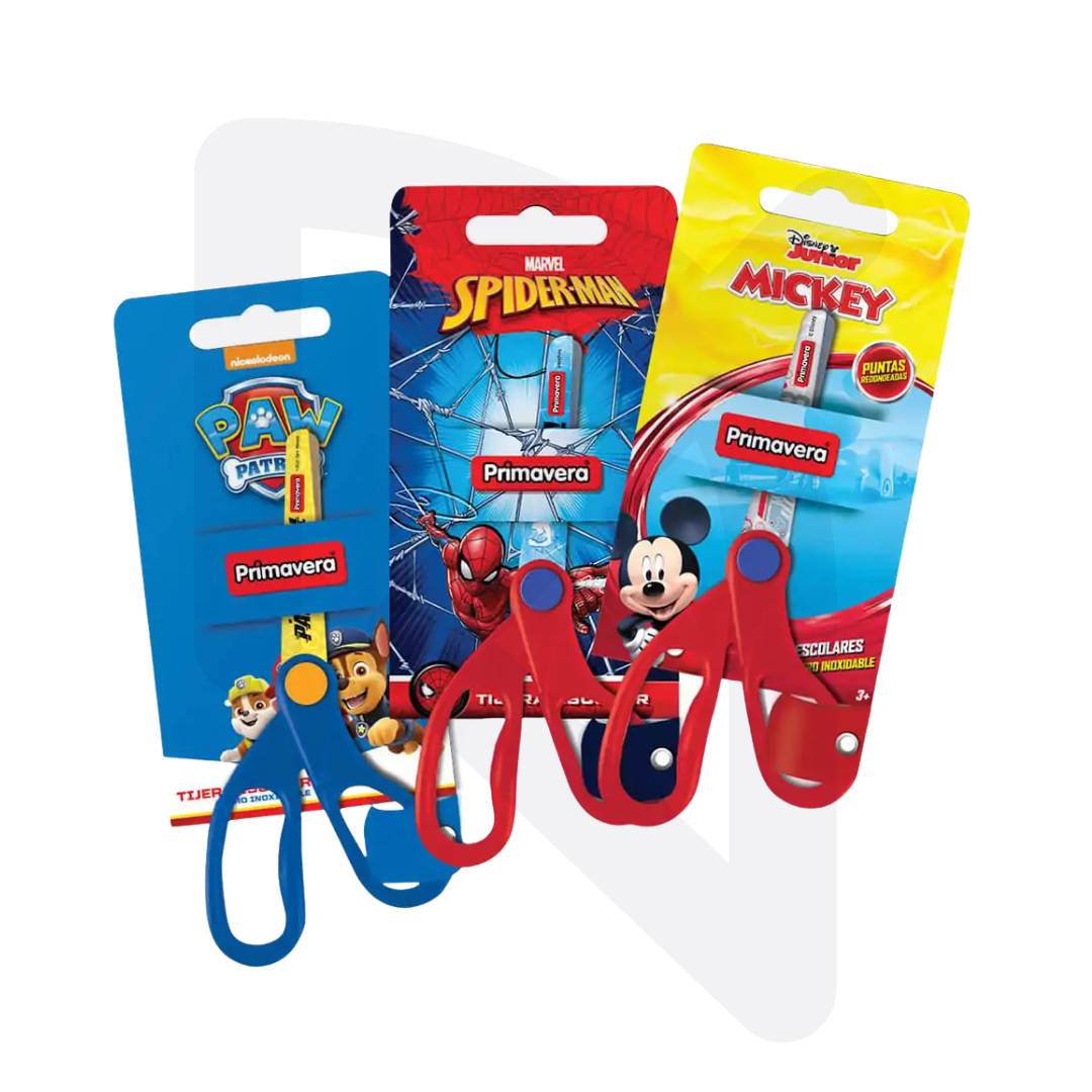 Tijera Primavera punta roma con personajes infantiles. Corte seguro y cómodo para actividades escolares y manualidades.