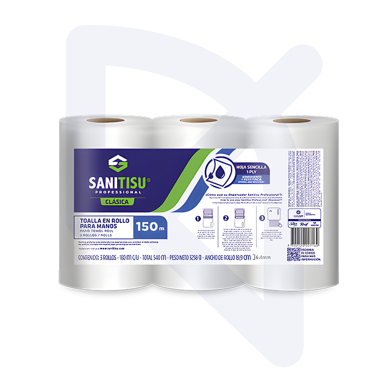 Toalla de manos hoja doble Sanitisu en rollo 150m, alta absorción y rendimiento. Ideal para baños institucionales y alto tráfico.