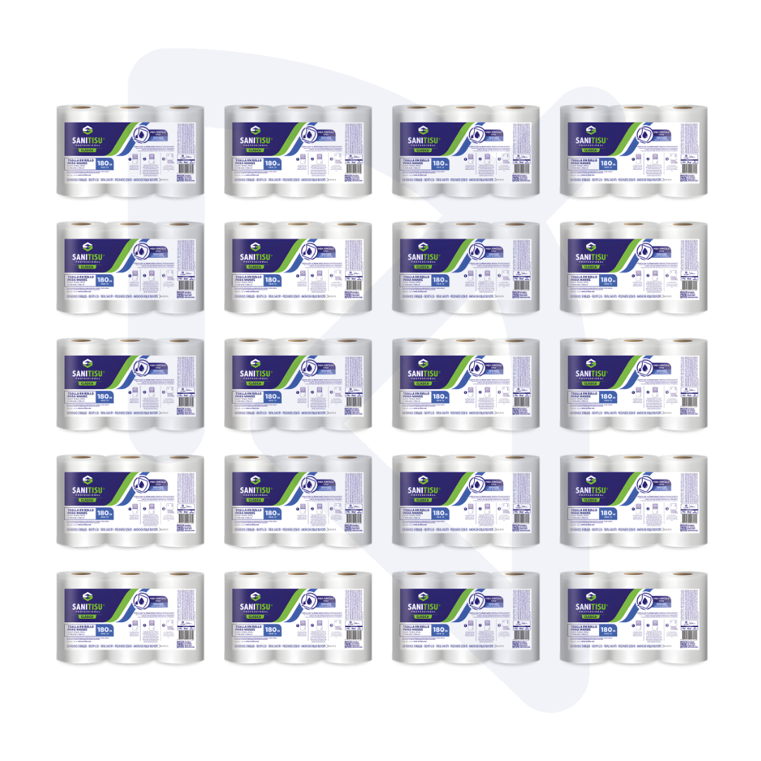Toalla de manos hoja sencilla Sanitisu en rollo 180m, alta absorción y rendimiento. Ideal para baños institucionales y alto tráfico.